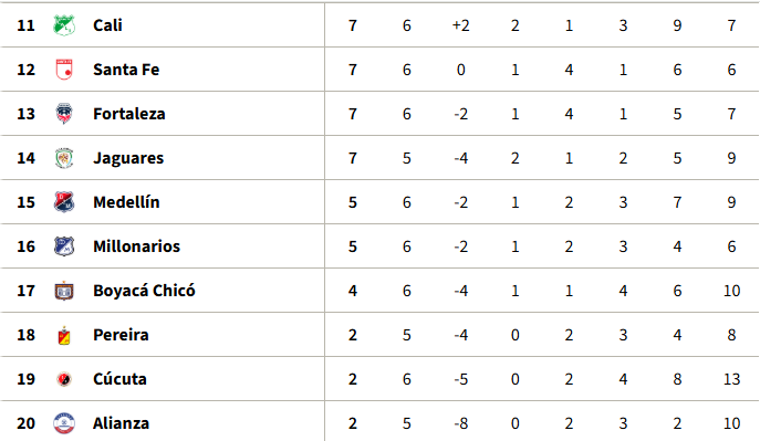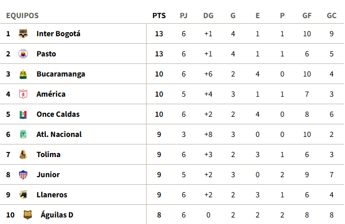 Tabla de Posiciones de la fecha 6 de la Liga BetPlay I-2026