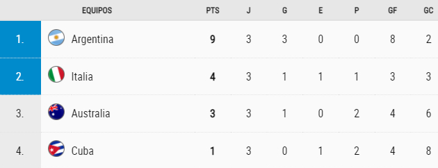 Por su parte Argentina derrotó a Italia y lidero la clasificación número ocho en la historia de los mundiales sub 20 de este milenio. Australia derrotó a Cuba y la dejo como última del grupo.