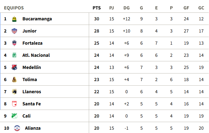 Bucaramanga gana y sigue líder, Junior triunfa de visitante, Santa Fe pierde de local. Así va la fecha 15
