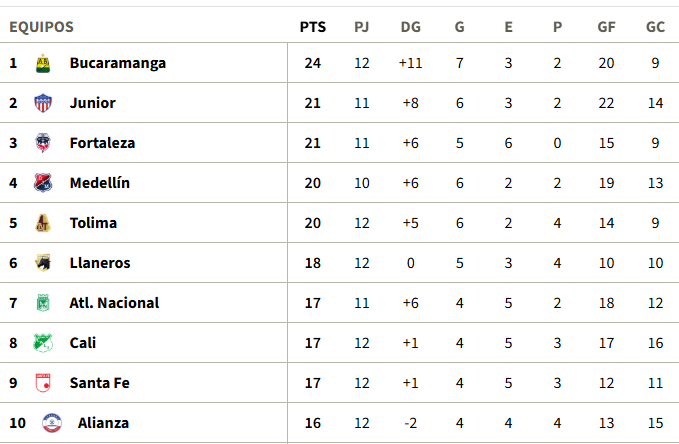Tabla de posiciones de la fecha 12 de la Liga BetPlay II-2025 (provisional)