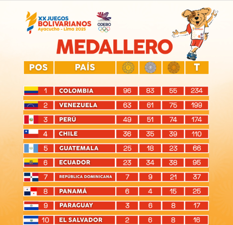 Tabla de Medallería Juegos Bolivarianos Lima 2025 día 12