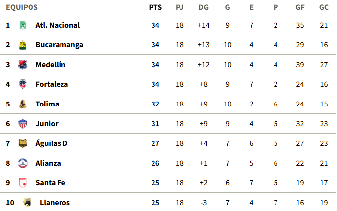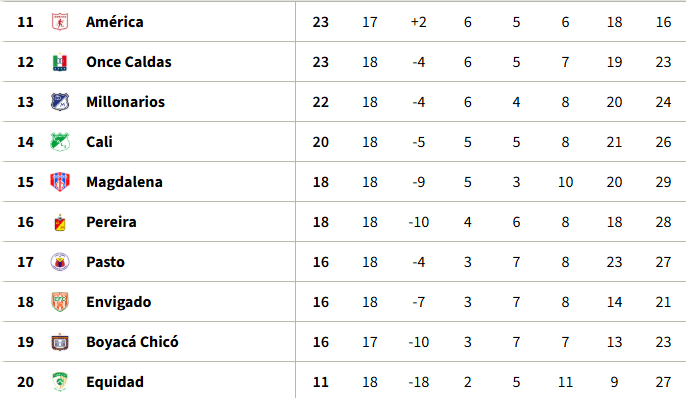 Tabla de Posiciones fecha 18 Liga BetPlay ll-2025