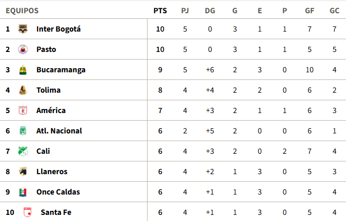 Tabla de posiciones de la fecha 5 de la Liga BetPlay I-2026