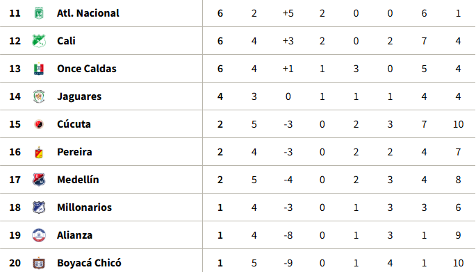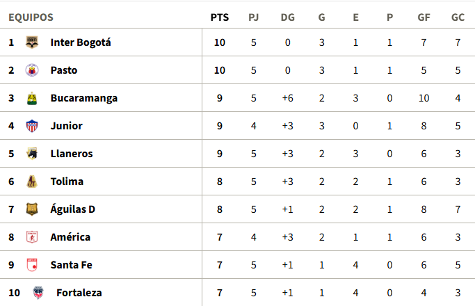 Tabla de posiciones de la fecha 5 de la Liga BetPlay I-2026 (provisional)