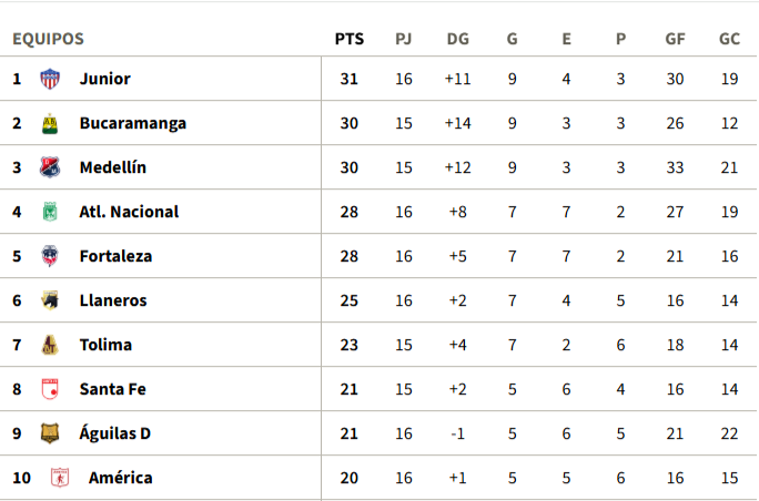 Tabla de Posiciones fecha 16 Liga BetPlay ll-2025 (provisional)