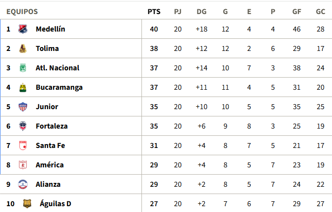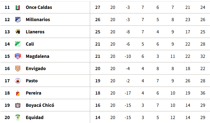 Tabla de Posiciones Fecha 20 Liga BetPlay ll-2025