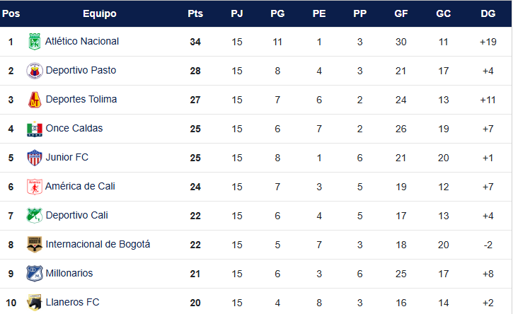 Atlético Nacional será visitante por la fecha 16 frente al Independiente Medellín en el clásico antioqueño Jaguares FC en partido adelantado ante Llaneros FC, cayó de visitante por marcador de 2-0.