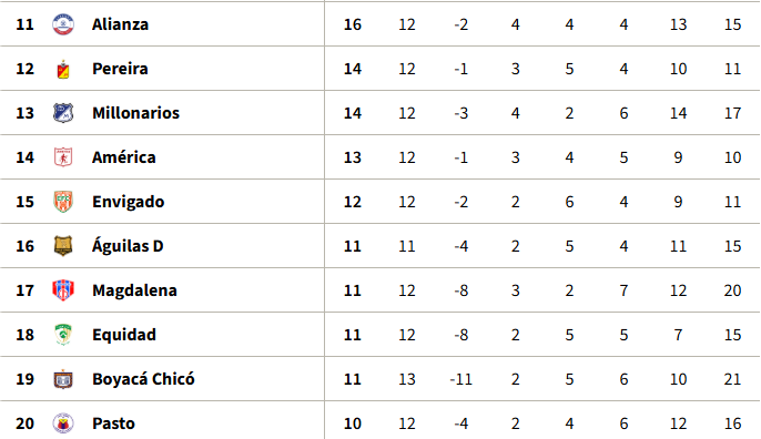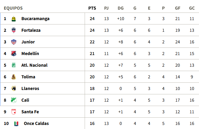 Tabla de Posiciones fecha 13 Liga BetPlay ll-2025 (provisional)