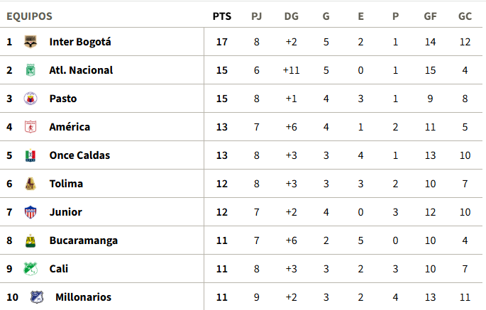 Tabla de Posiciones fecha 9 Liga BetPlay l-2026 (provisional)