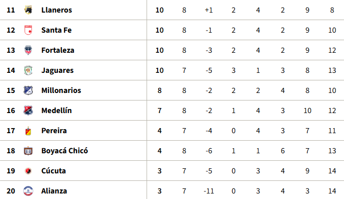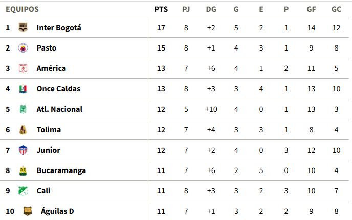 Tabla de Posiciones fecha 8 Liga BetPlay l-2026 (provisional)