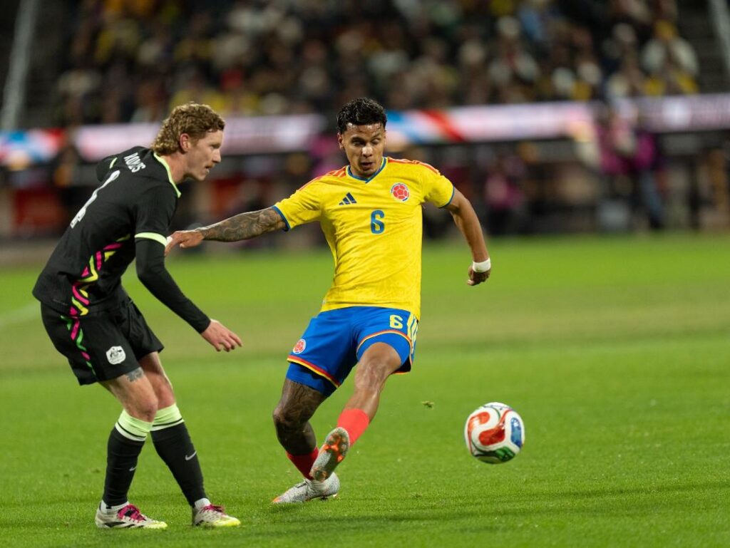 Richard Ríos que regreso a la titular del equipo cafetero disputa un balón con uno de los mediocampistas australianos. Foto: BRIANT MÉNDEZ.